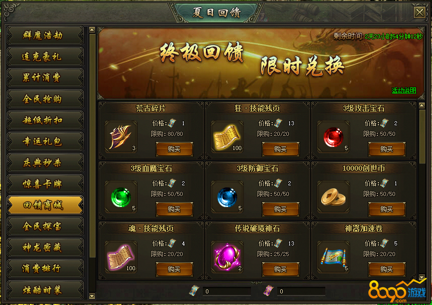活动说明:活动期间,可使用充值回馈卷和消费回馈卷兑换大量奖励