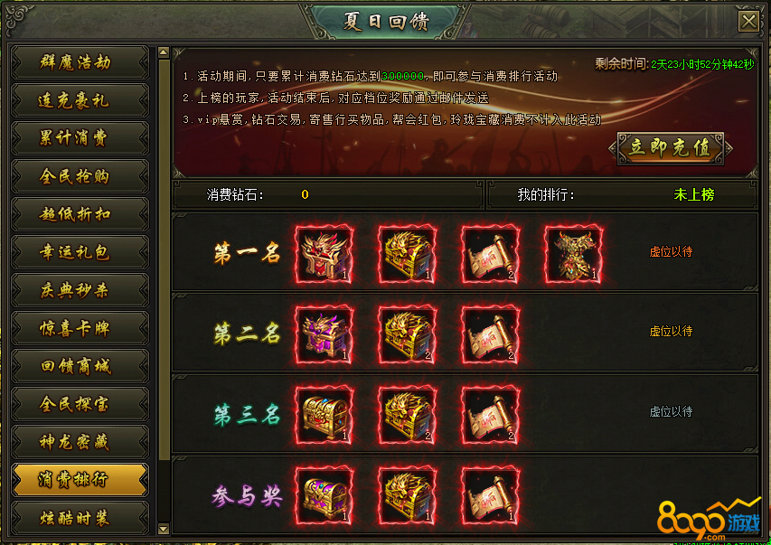 活动说明:活动期间,累计消费达到300000钻石的玩家参与排行,奖励在活动结束后以邮件的方式进行发放