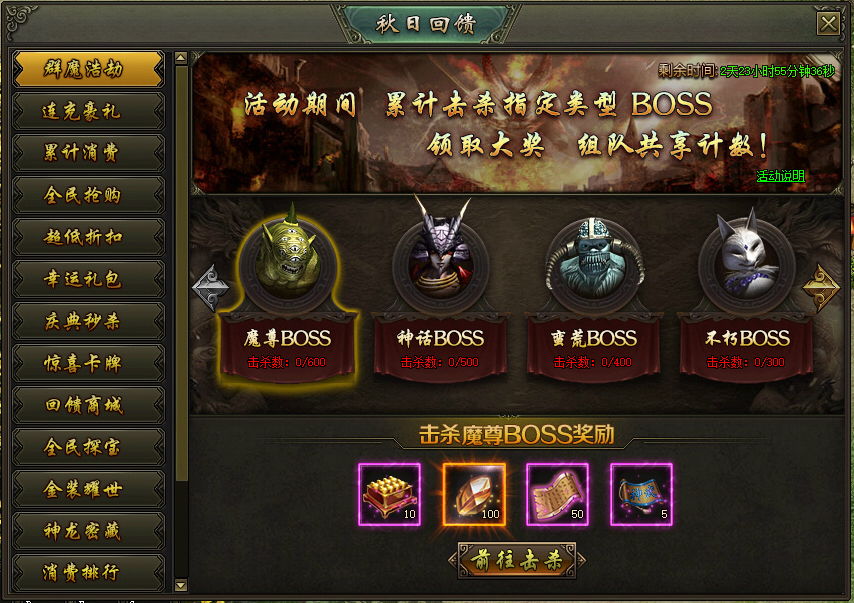 活动说明:活动期间,累计击杀指定类型BOSS,可领取超值奖励