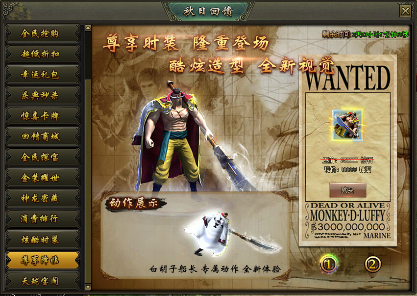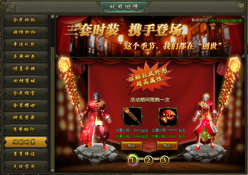 活动说明:活动期间,绝版时装限时出售,炫酷拉风外型、超高属性都在这里!