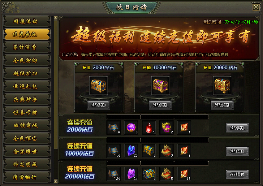 活动说明:活动期间,每天累计充值到指定档位即可领取对应奖励,连续充值3天可领取连充大奖