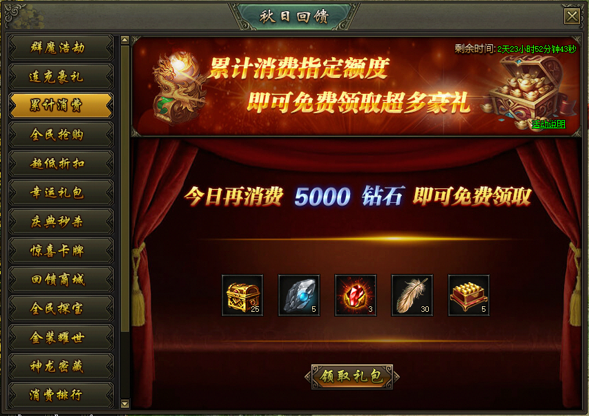 活动说明:活动期间,每日累计消费钻石数达到指定额度可领取超多豪礼