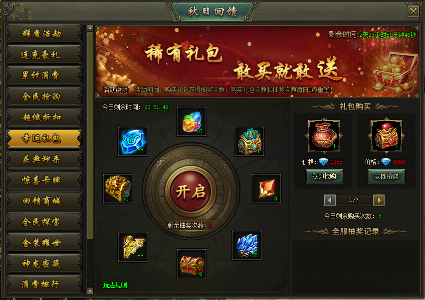 活动说明:活动期间,购买礼包获得抽奖次数,购买礼包次数和抽奖次数每日0点重置。