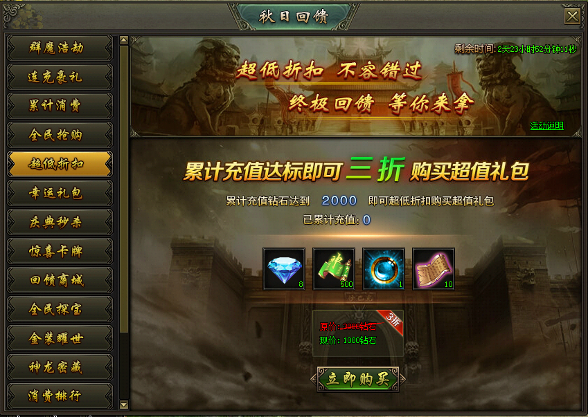 活动说明:活动期间,累计充值达到指定额度,即可购买超低折扣礼包