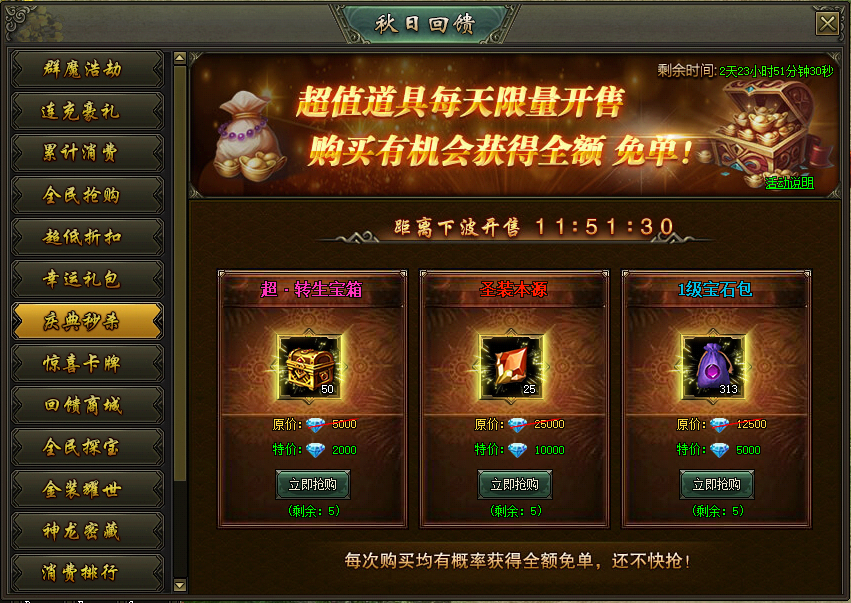 活动说明:活动期间,超值道具每天限量开售,购买更有机会获得全额免单