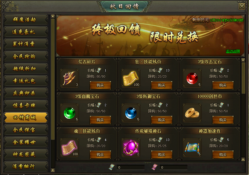 活动说明:活动期间,可使用充值回馈卷和消费回馈卷兑换大量奖励