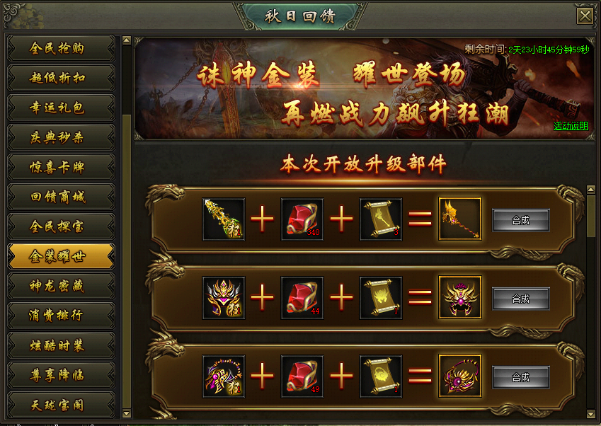 活动说明:活动期间,诸神金装耀世登场,穿戴后战力飙升