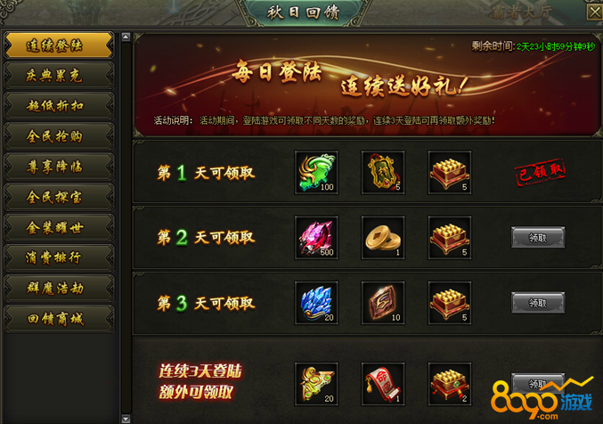 活动说明:活动期间,登陆游戏可领取不同天数的奖励,连续3天登陆可再领取额外奖励