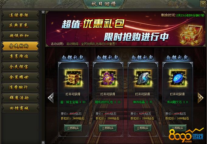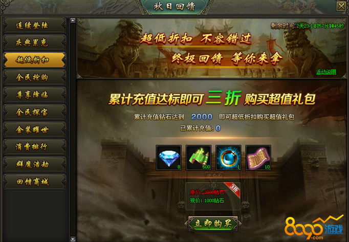 活动说明:活动期间,累计充值一定钻石即可超低折扣购买礼包