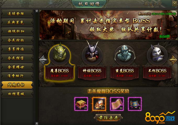 活动说明:活动期间,累计击杀指定类型BOSS,可领取超值奖励!