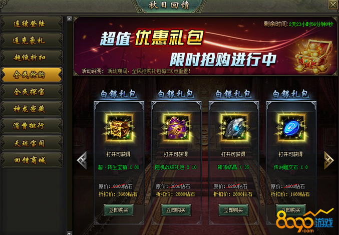 活动说明:活动期间,累计充值达到指定额度,即可购买超低折扣礼包