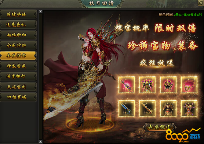 活动说明:活动期间,龙之宝藏产出圣装的概率限时翻倍,极品圣装、珍稀宝物大放送!