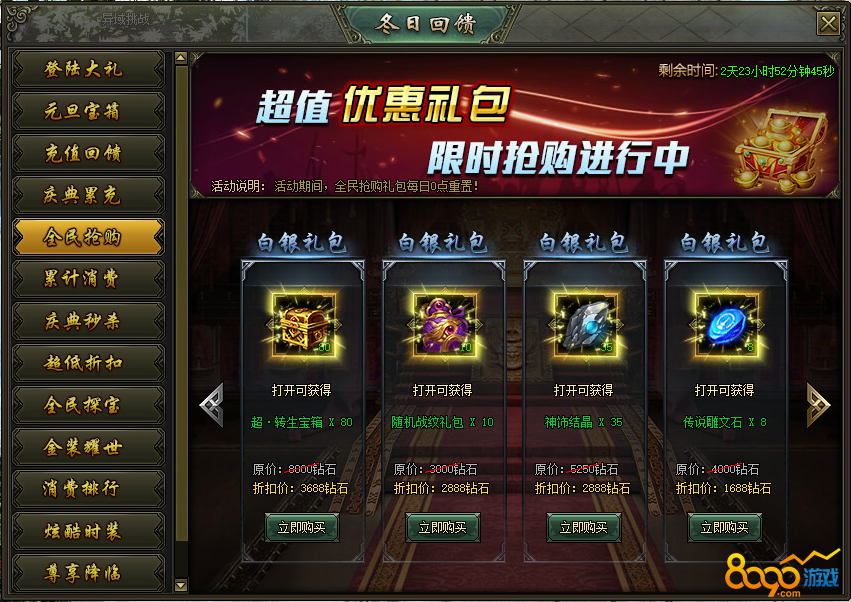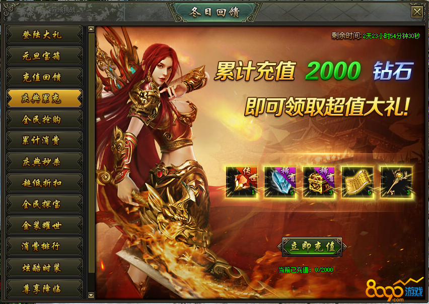 活动说明:活动期间,累计充值达到指定额度,即可购买超低折扣礼包