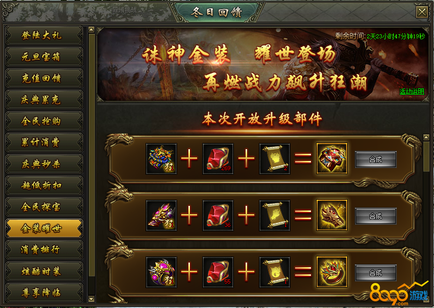 活动说明:活动期间,诛神金装耀世登场,穿戴之后战力飙升