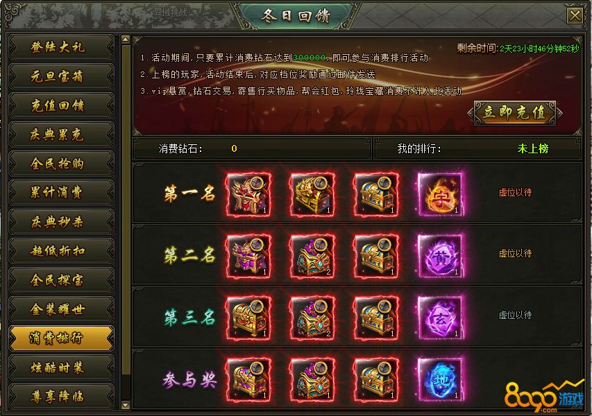 活动说明:活动期间,累计消费达到300000钻石的玩家可参与排行,奖励在活动结束后以邮件的方式进行发放