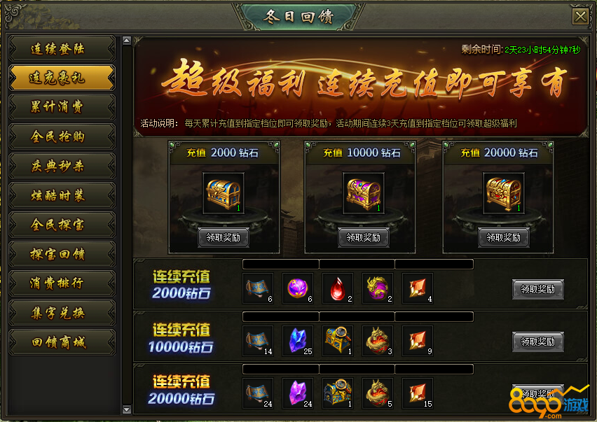 活动说明:活动期间,每天累计充值到指定档位即可领取对应奖励,连续充值3天可领取连充大奖