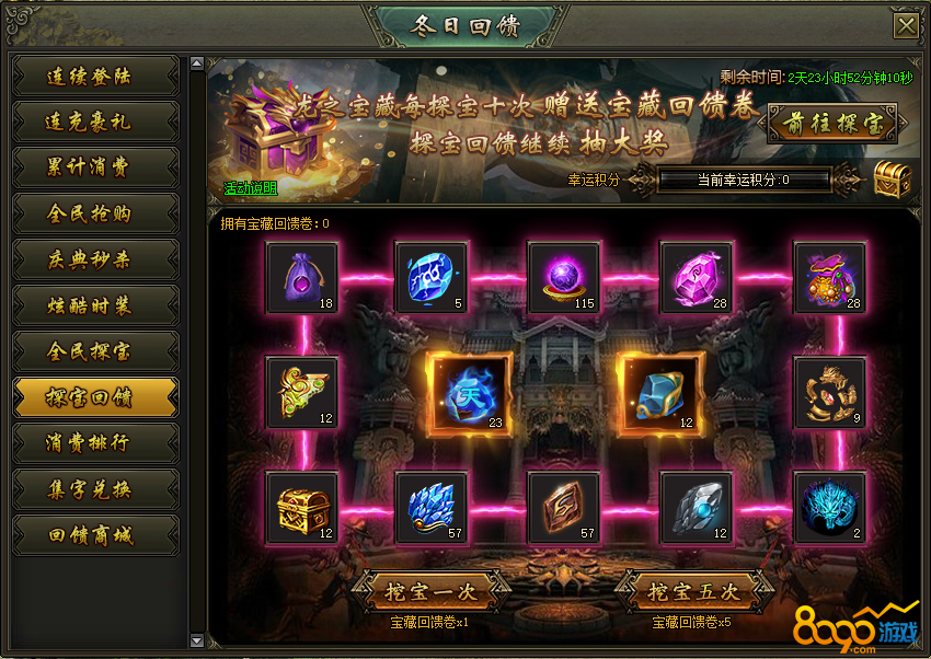 活动说明:活动期间,龙之宝藏每探宝十次赠送一张宝藏回馈卷,可继续在探宝回馈抽大奖