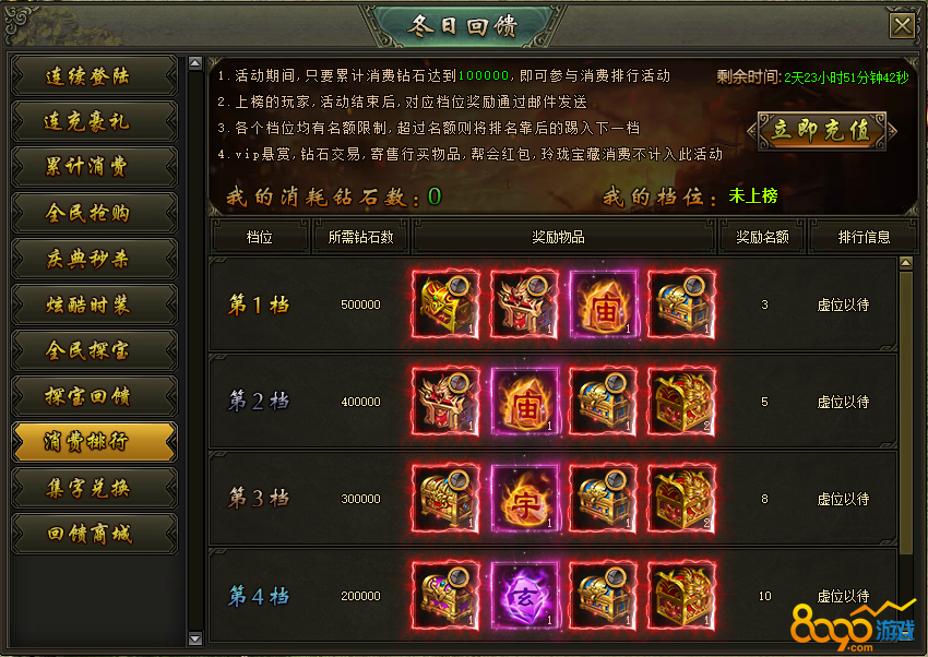 活动说明:活动期间,累计消费达到100000钻石的玩家参与排行,达到对应档位的玩家奖励在活动结束后以邮件的方式进行发放