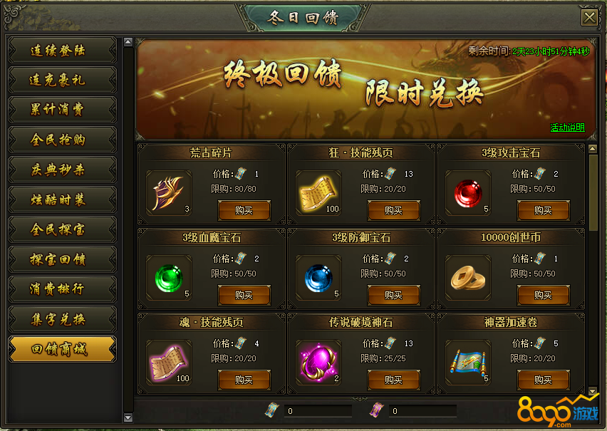 活动说明:活动期间,可使用充值回馈卷和消费回馈卷兑换大量奖励