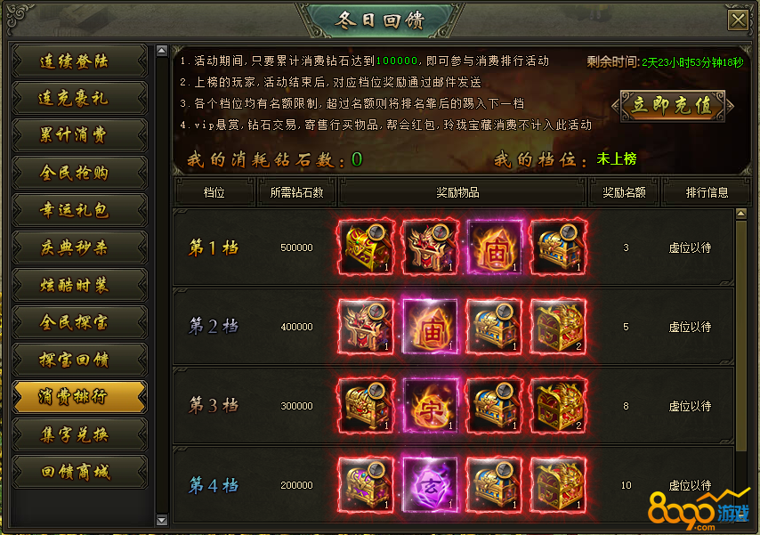 活动说明:活动期间,累计消费达到100000钻石的玩家参与排行,达到对应档位的玩家奖励在活动结束后以邮件的方式进行发放