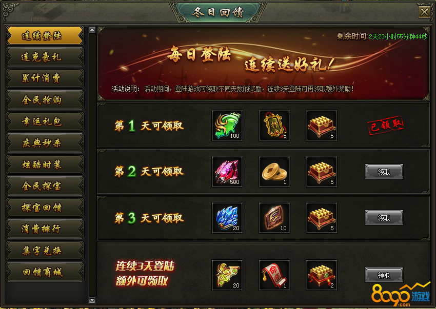 活动说明:活动期间,登陆游戏可领取不同天数的奖励,连续3天登陆可再领取额外奖励
