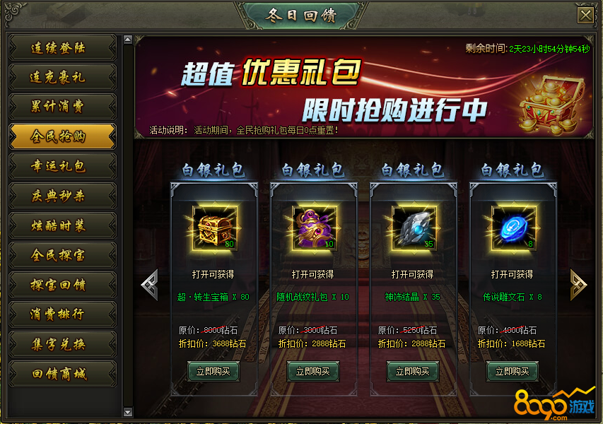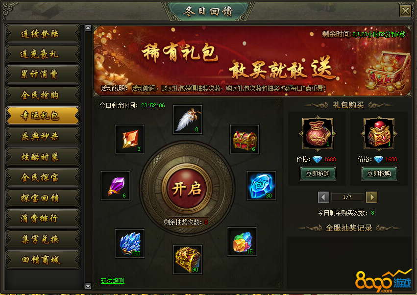 活动说明:活动期间,购买礼包获得抽奖次数,购买礼包次数和抽奖次数每日0点重置。