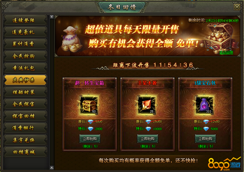 活动说明:活动期间,超值道具每天限量开售,购买就有机会获得全额免单!