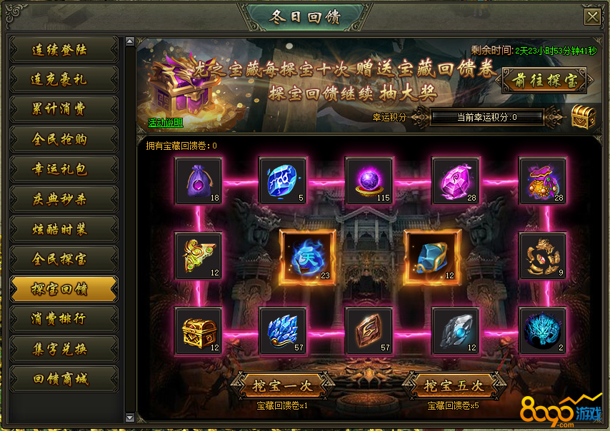 活动说明:活动期间,龙之宝藏每探宝十次赠送一张宝藏回馈卷,可继续在探宝回馈抽大奖