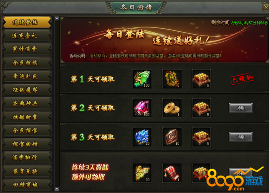 活动说明:活动期间,登陆游戏可领取不同天数的奖励,连续3天登陆可再领取额外奖励