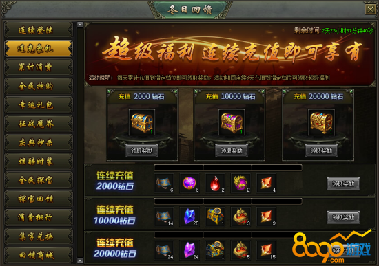活动说明:活动期间,每天累计充值到指定档位即可领取对应奖励,连续充值3天可领取连充大奖