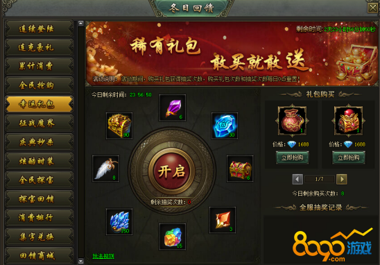 活动说明:活动期间,购买礼包获得抽奖次数,购买礼包次数和抽奖次数每日0点重置。