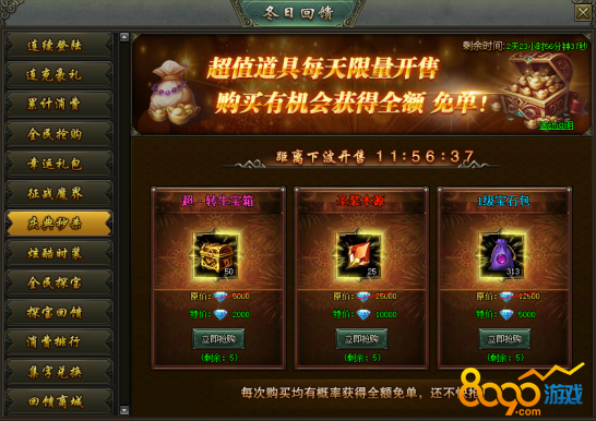 活动说明:活动期间,超值道具每天限量开售,购买就有机会获得全额免单!
