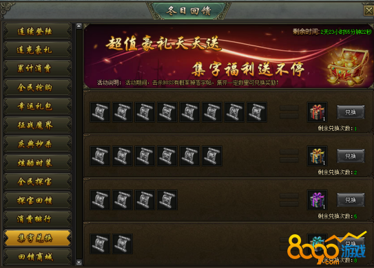 活动说明:活动期间,击杀BOSS有概率掉落字帖,集齐一定数量可兑换奖励!