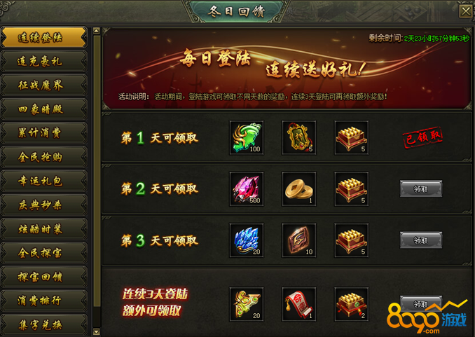 活动说明:活动期间,登陆游戏可领取不同天数的奖励,连续3天登陆可再领取额外奖励