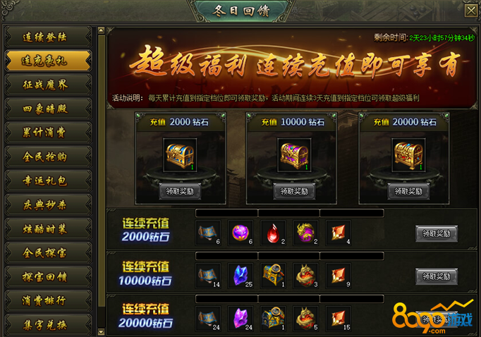 活动说明:活动期间,每天累计充值到指定档位即可领取对应奖励,连续充值3天可领取连充大奖