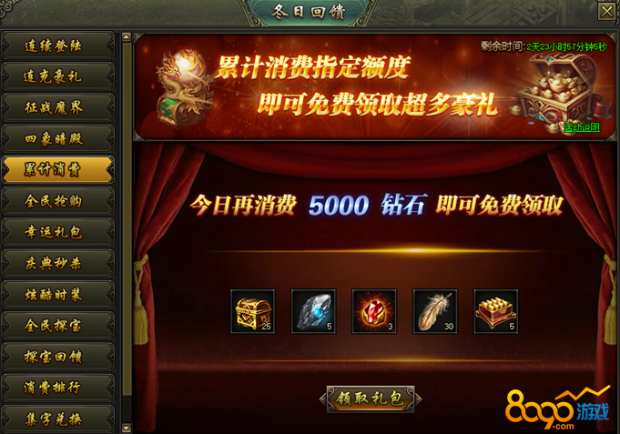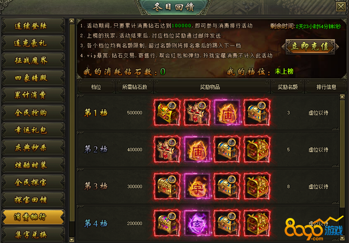 活动说明:活动期间,累计消费达到100000钻石的玩家参与排行,达到对应档位的玩家奖励在活动结束后以邮件的方式进行发放