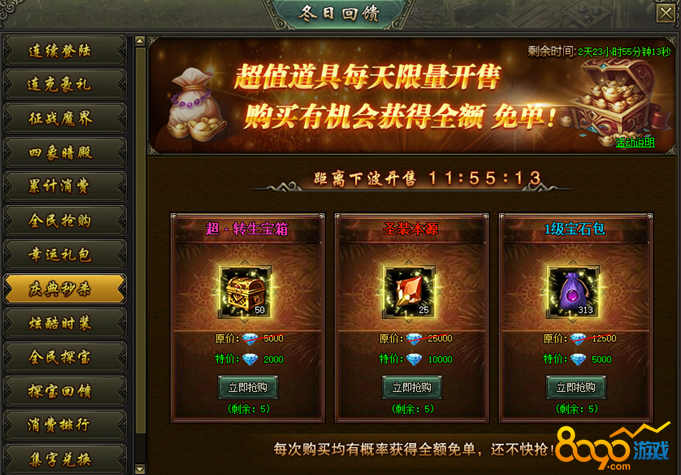 活动说明:活动期间,超值道具每天限量开售,购买就有机会获得全额免单!