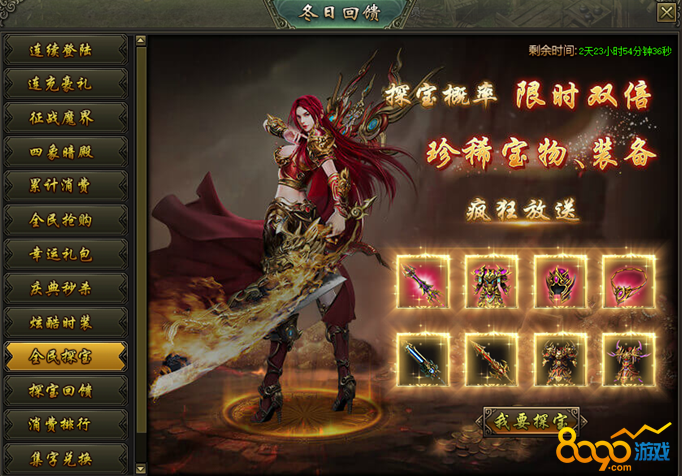 活动说明:活动期间,龙之宝藏产出圣装的概率限时翻倍,极品圣装、珍稀宝物大放送!