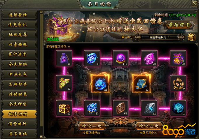 活动说明:活动期间,龙之宝藏每探宝十次赠送一张宝藏回馈卷,可继续在探宝回馈抽大奖