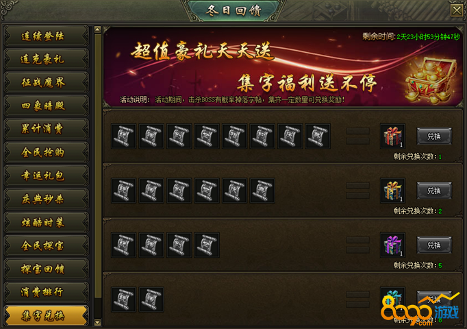 活动说明:活动期间,击杀BOSS有概率掉落字帖,集齐一定数量可兑换奖励!
