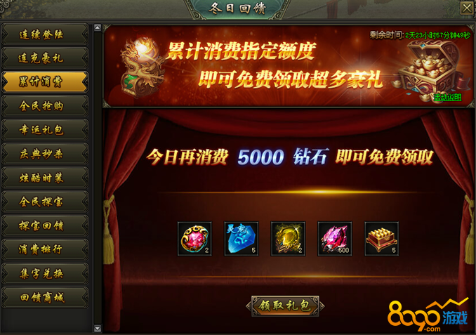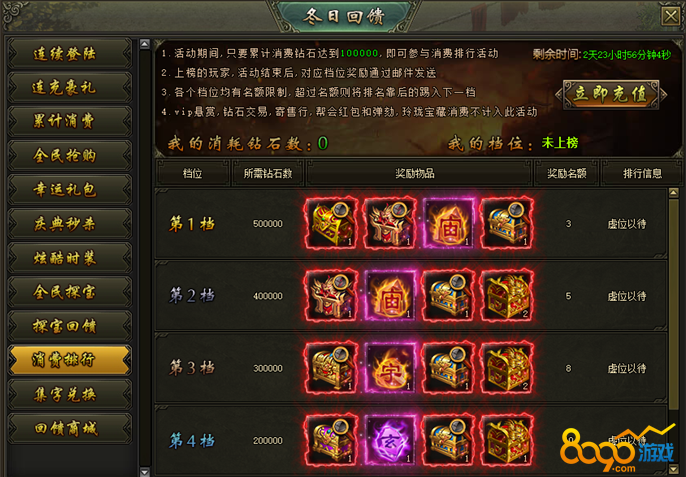 活动说明:活动期间,累计消费达到100000钻石的玩家参与排行,达到对应档位的玩家奖励在活动结束后以邮件的方式进行发放