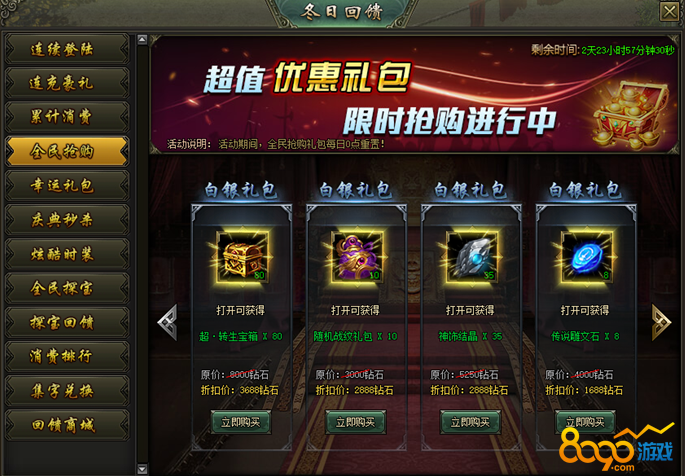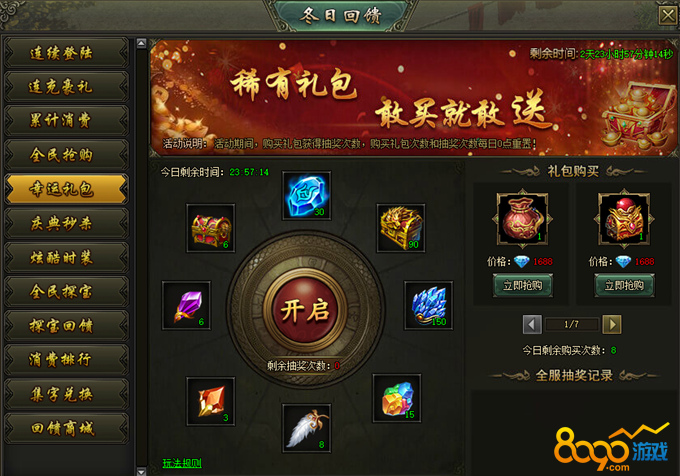 活动说明:活动期间,购买礼包获得抽奖次数,购买礼包次数和抽奖次数每日0点重置。