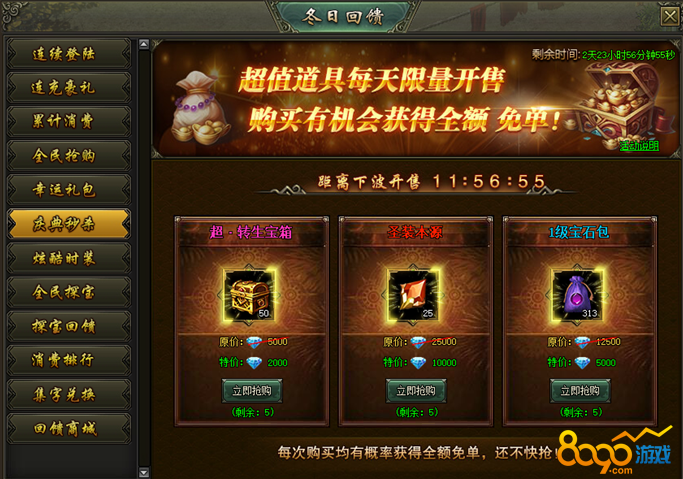 活动说明:活动期间,超值道具每天限量开售,购买就有机会获得全额免单!