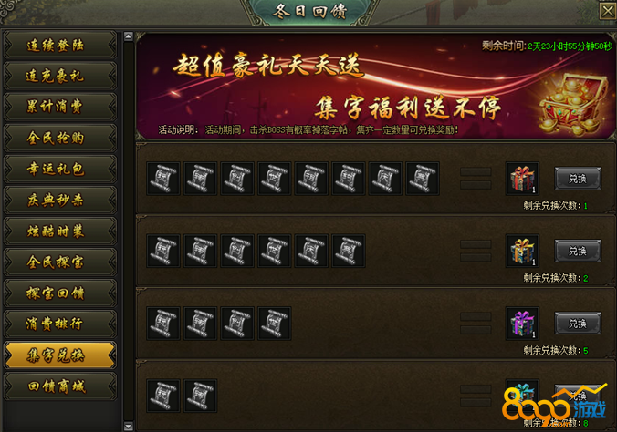 活动说明:活动期间,击杀BOSS有概率掉落字帖,集齐一定数量可兑换奖励!