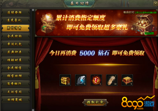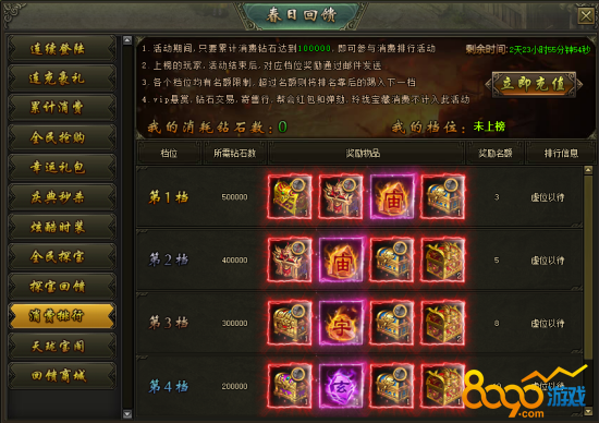 活动说明:活动期间,累计消费达到100000钻石的玩家参与排行,达到对应档位的玩家奖励在活动结束后以邮件的方式进行发放