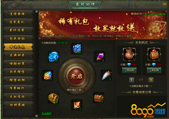 活动说明:活动期间,购买礼包获得抽奖次数,购买礼包次数和抽奖次数每日0点重置。