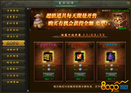 活动说明:活动期间,超值道具每天限量开售,购买就有机会获得全额免单!