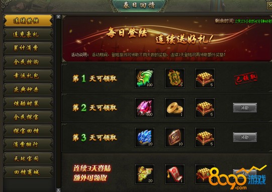活动说明:活动期间,登陆游戏可领取不同天数的奖励,连续3天登陆可再领取额外奖励