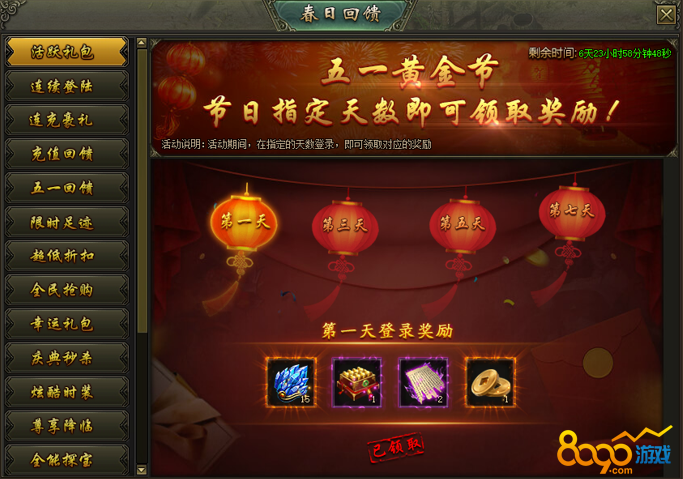 活动说明:活动期间,在指定天数登陆游戏,即可领取对应的奖励