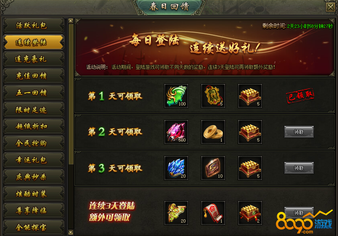 活动说明:活动期间,登陆游戏可领取不同天数的奖励,连续3天登陆可再领取额外奖励